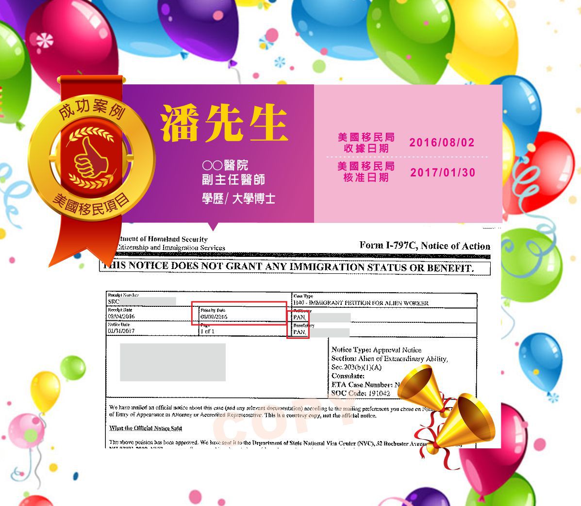 賀!2017年1月30日 潘先生美國專才移民5個月核准