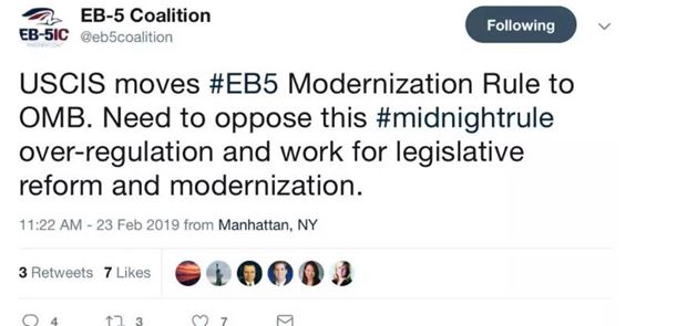 @OMB【移民局EB-5改革法规提案送交白宫审议】据美国EB-5业内消息,已经发现2017年移民 局推出的EB-5改革法规已提交至白宫预算管理办公室(OMB)进行审议,距离发布只剩最后一 步。