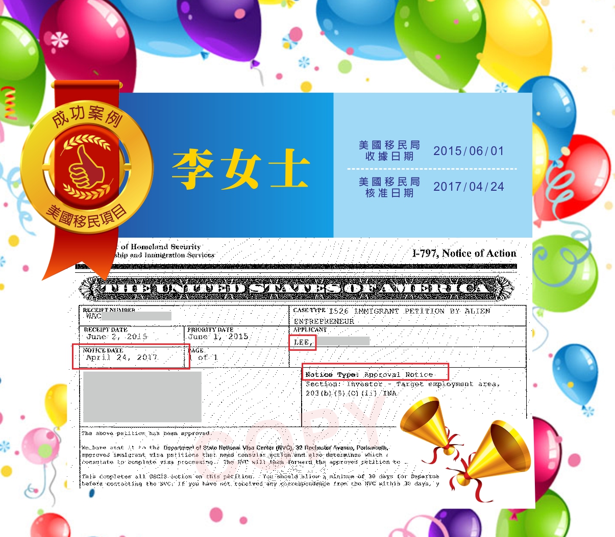 賀!2017年4月25日 李女士美國投資移民核准通過!