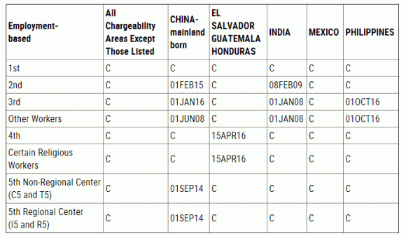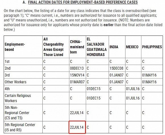 表A – 最終裁定日 (FAD):表A,最終裁定日(FAD)的截止日重新啟動,不過仍然停留在2014年7月22日。表B – 遞交申請日 (DFA):表B,DFA截止日也是停滯在2014年9月1日。新財年,移民局未開啟所有職業移民的表B,故將無法提前調整身份,但是在這個日子之前的投資人可以繳納NVC費用。