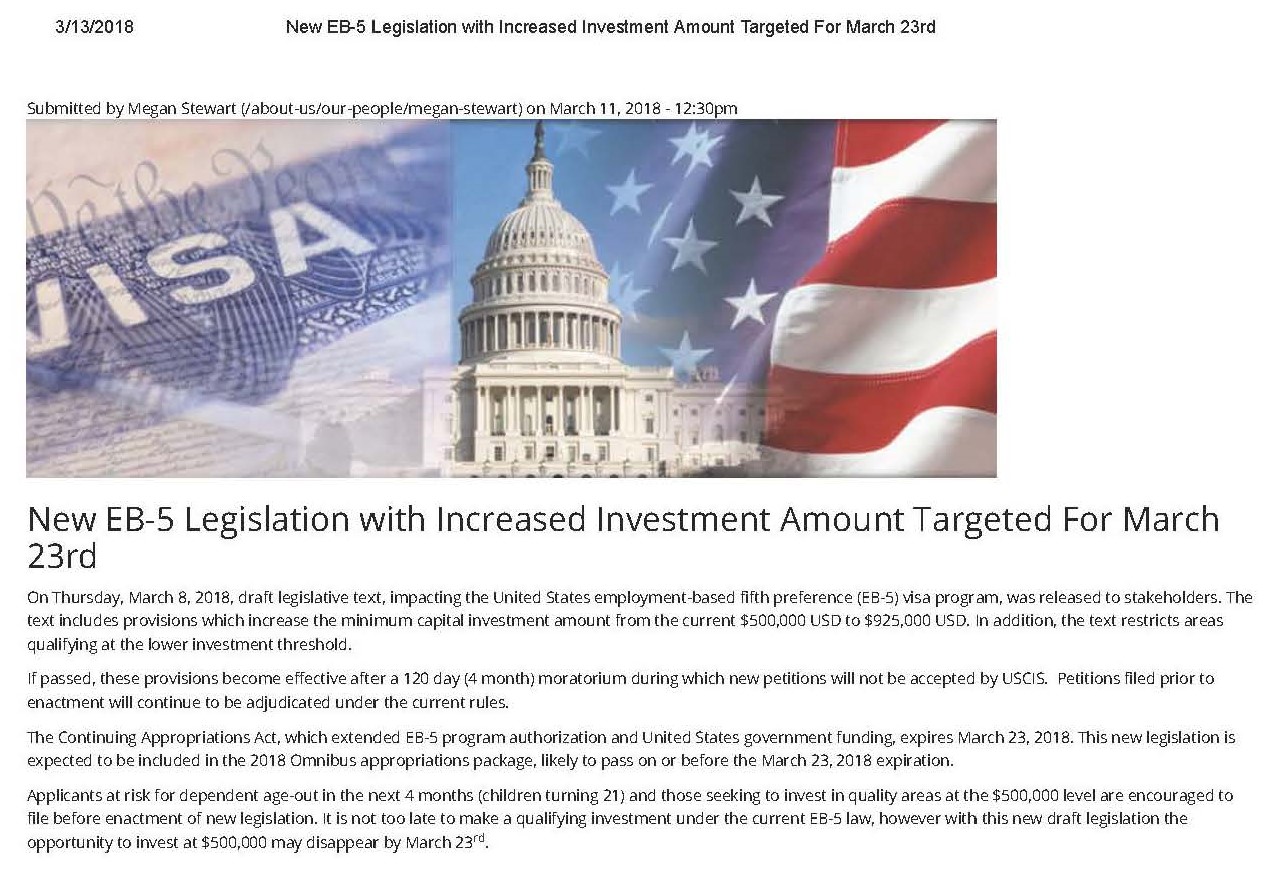 2018年3月8日,星期四,影響到美國 EB-5 簽證計畫的立法草案被發布給利益相關者。該草案包括將最低資本投資金額從目前的$500,000 美元提高至$925,000美元的條款,此外,案文還限制投資門檻較低的區域。