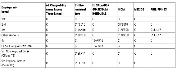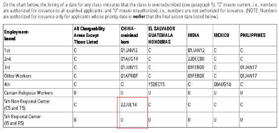 此外,表B即遞交申請日(DFA)表上,中國大陸出生投資人的截止日期保持不變,依舊為2014年9月1日。但EB-1傑出人才簽證類繼續保持無排期狀態,意味著如果移民局使用表B,那麼申請人一旦審批通過,即可以向移民局遞交身份轉換檔。