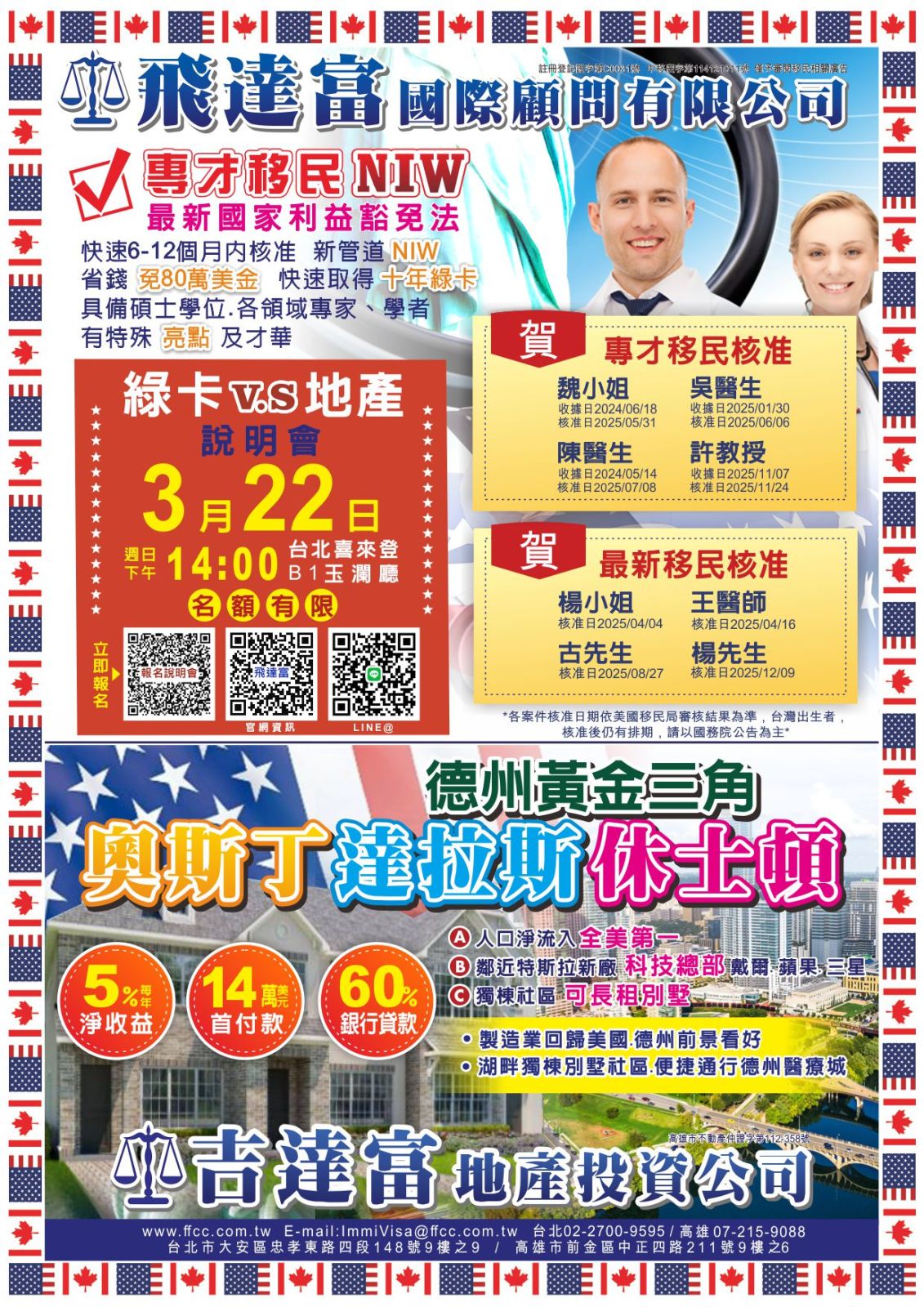 2026.03.22 飛達富 台北場喜來登 美國綠卡留學座談會 立即預約,名額有限!