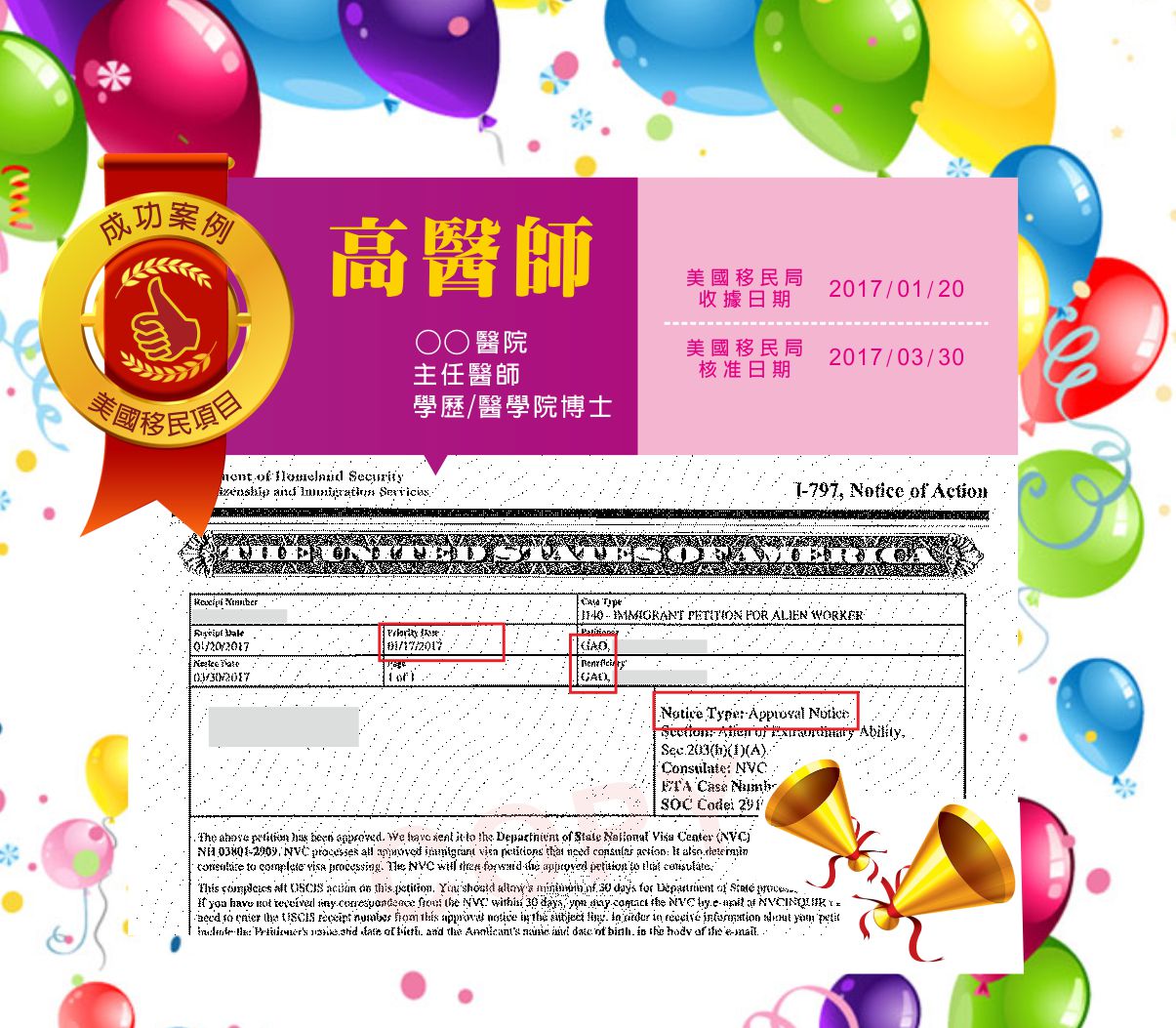 賀!2017年3月30日 高先生美國專才移民2個月快速核准!