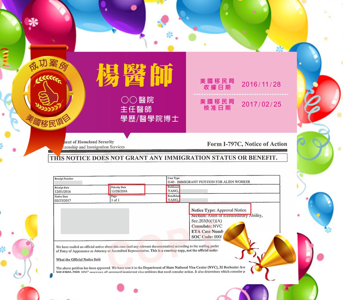 賀!2017年2月25日 楊先生美國專才移民3個月核准