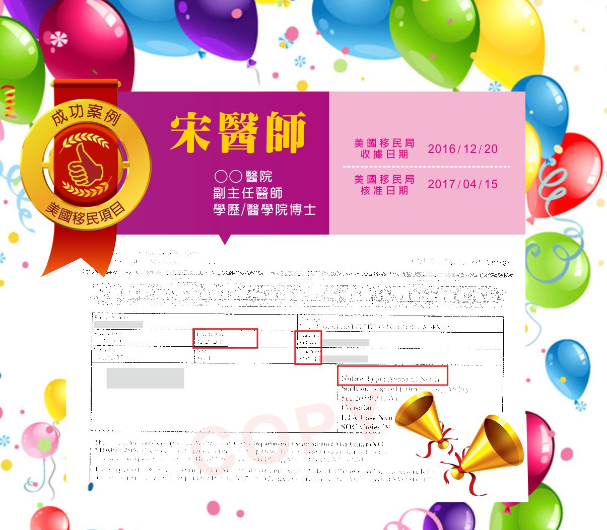賀!2017年4月15日 宋醫師美國專才移民3個半月核准