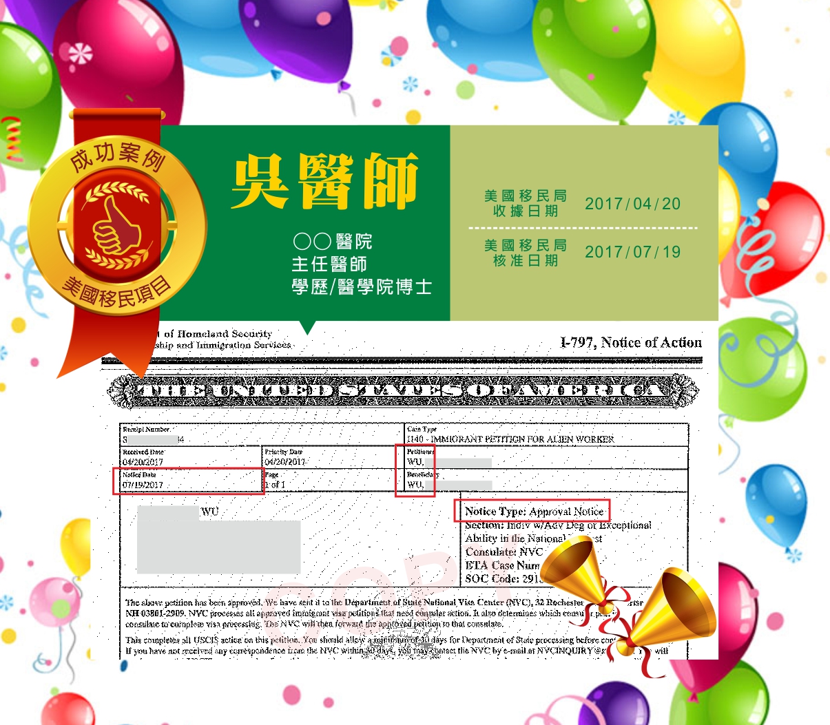 賀!2017年7月19日 吳先生美國專才移民3個月核准